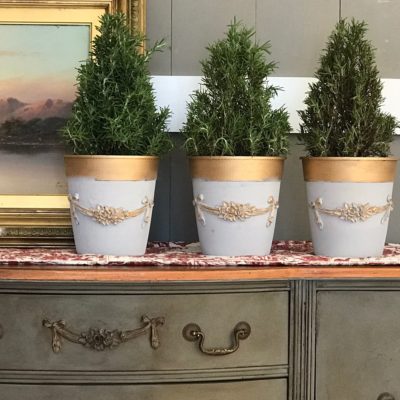 1 – Our favorite holiday hostess and party gift is this seasonal planter You can use almost anything: clay pots with a rosettes or swags attached then fill with seasonal bulbs or herbs like this rosemary plant.