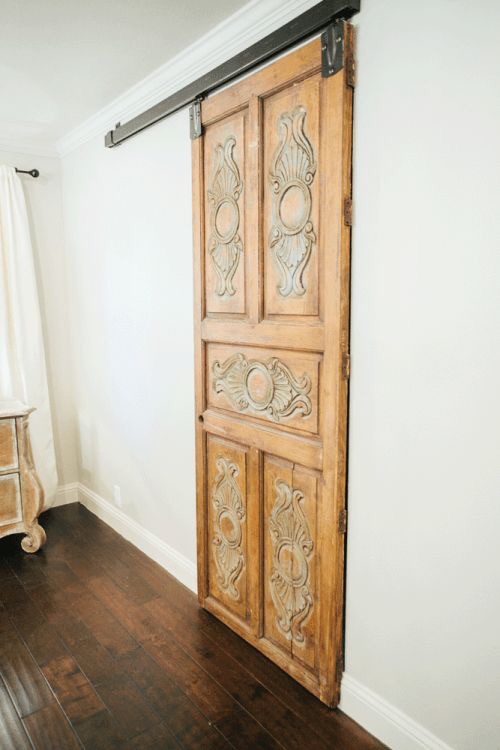 I found this picture on Tumblr, and just fell in love love love. The sliding door and barn style hardware give it a great country vibe. The addition of the wood carvings takes it to a whole new level.