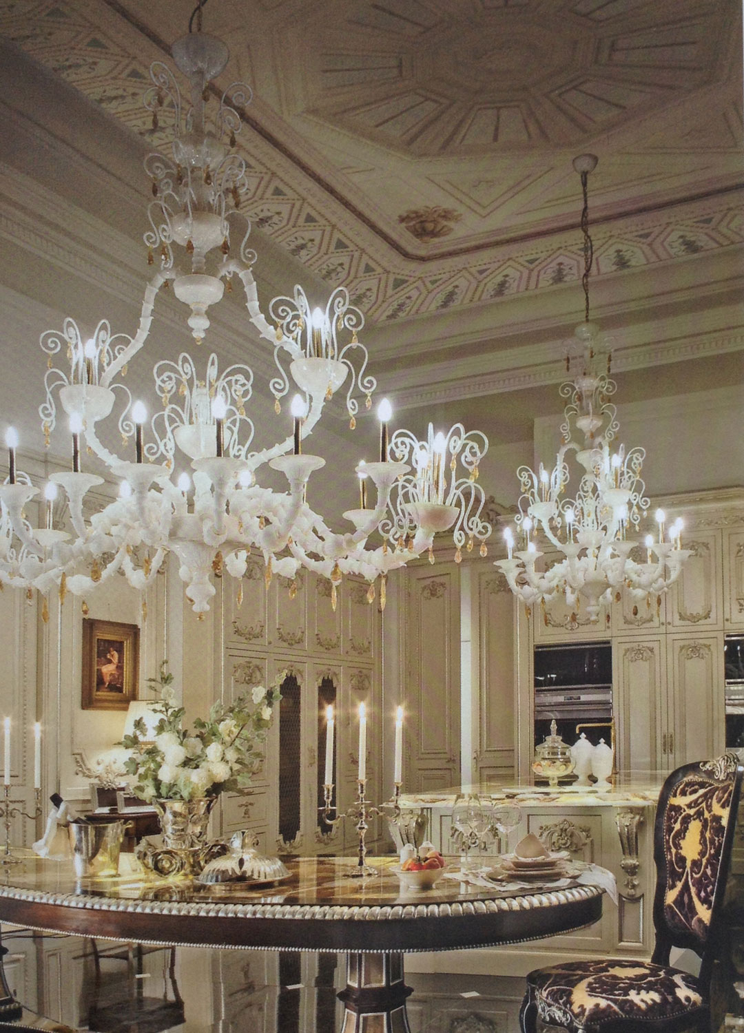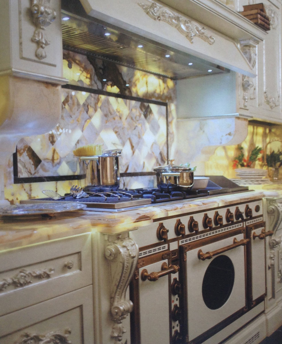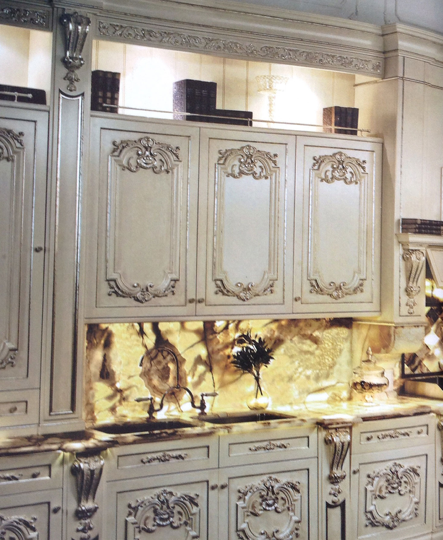 The cabinets are decorated with carved reliefs. You can get the same look for a whole lot less using Efex, easy decorative moldings.
