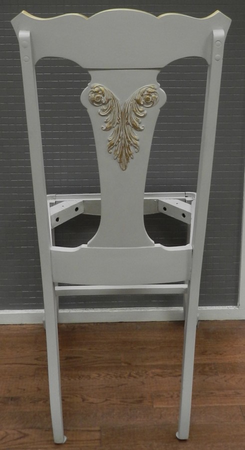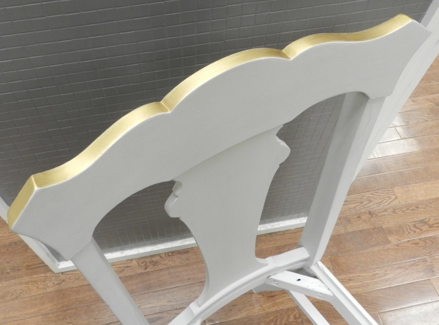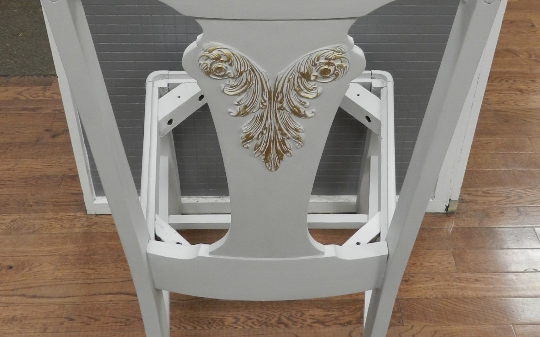 Normally this bendable moulding goes on Queen Anne legs, but we had a better idea! It fit perfectly on the backs of her chairs. Efex are really easy to apply to any surface, just use contact cement. Brush some on the back of the moulding, and on the surface you’re adhering to, and when the glue is dry to touch, press them together! We finished these with the same grey paint and Classic Gold Gilding Wax.