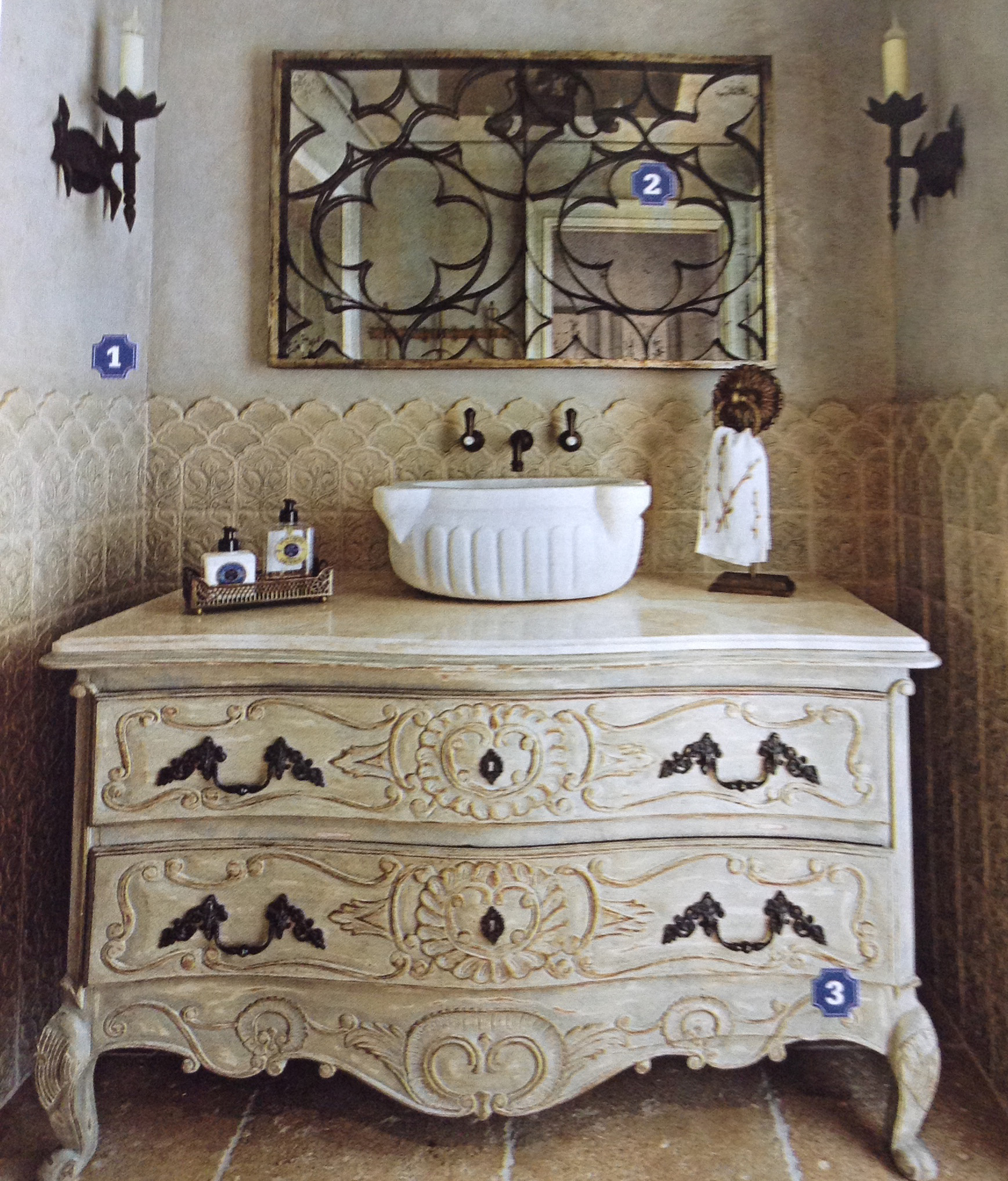 First is the awesome guest bath sink, it would be so easy to get this look with our scrolls and rosettes.
